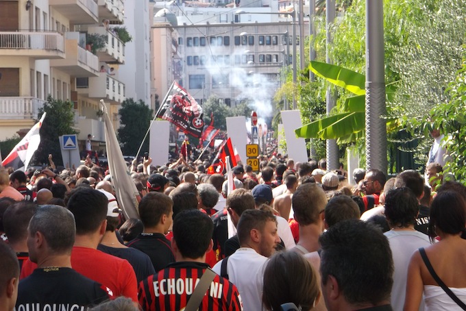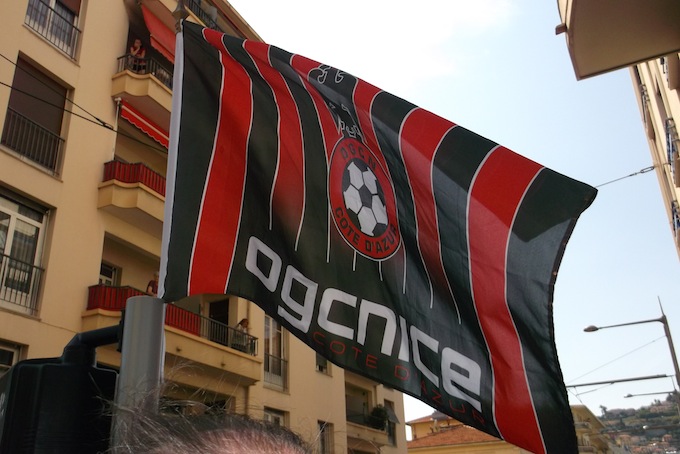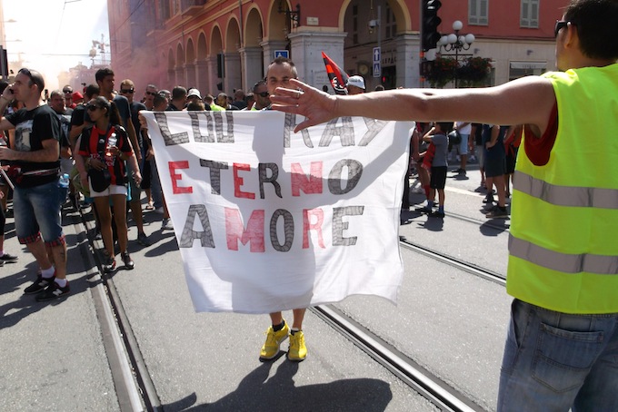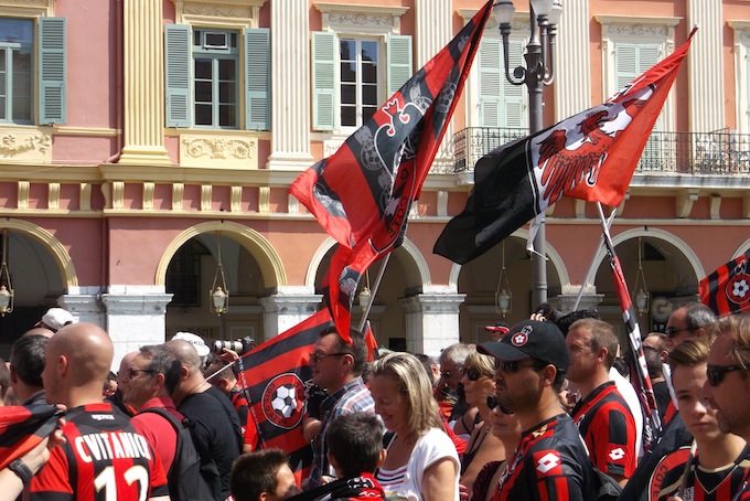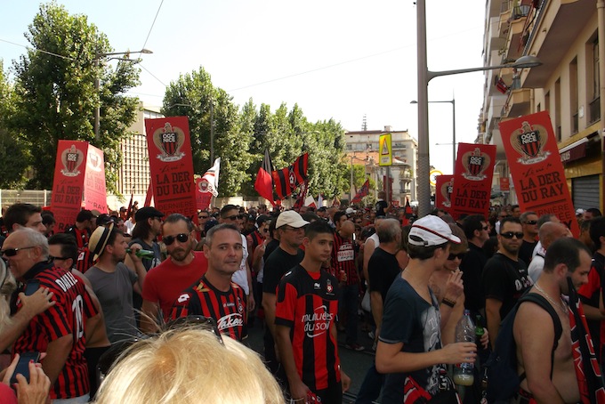 Place Masséna was the meeting point for the Dernière Montée au Ray today, a procession that took fans all the way through Nice up to the Stade du Ray for OGC Nice’s final home match in the famed stadium. Several thousand people turned up for the event, which was generally good-natured and went off peacefully.