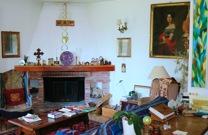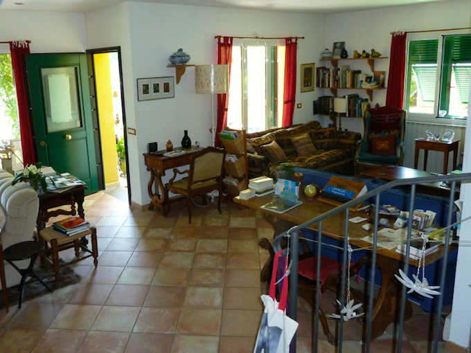 A well-constructed country road connects the house with Dolceacqua and a cemented private road leads through an electric gate on to the grounds with off street parking for up to 8 cars. A garden gate gives access to the ground floor roof-covered terrace with the main entrance, which opens into a large open space split into three sections. To the left is a comfortable sitting area with open fireplace. Adjacent is another seating arrangement with library and TV lounge and an alcove passage leads through to the dining room.