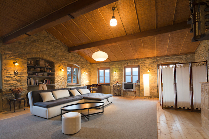 The larger of the two measures 140 sq.m., split over ground and first floor with both floor levels connected by both an internal and an external staircase. A 50 sq.m. living area forms the focal point of the ground floor. The very high ceilings made it possible to create a 18 sq.m. gallery space, perfect for use as a bedroom to sleep 2-3 people. A beautifully tiled stove keeps the room comfortably warm and a shower room decorated with attractive tiling, rounds up this floor level.