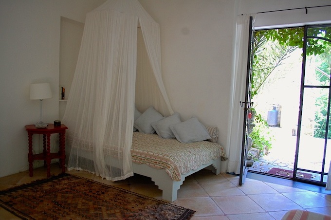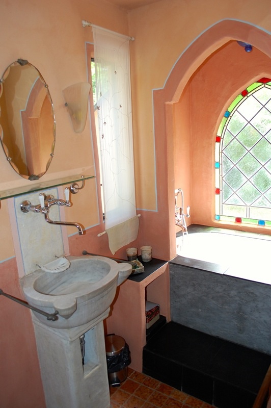 Adjacent are the comfortable lounge with open fireplace and a bathroom. A curved stone staircase leads up to the first floor where there is a bedroom with balcony and another interconnected bedroom with access to the garden.